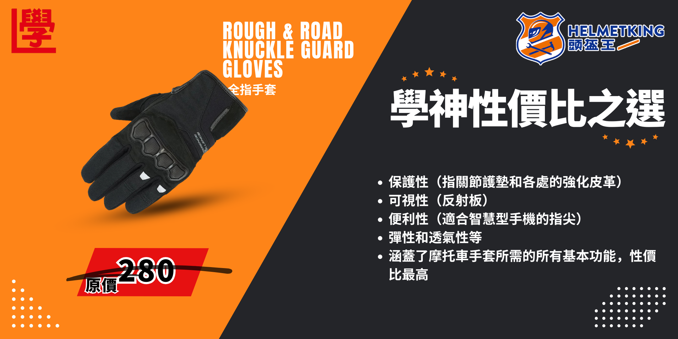 剛剛學車,學習車輛的操控及有基本保護最緊要!ROUGH & ROADKNUCKLE GUARD GLOVES 保護性(指關節護墊和各處的強化皮革)、可視性(反射板)、便利性(適合智慧型手機的指尖)、彈性和透氣性等,涵蓋了摩托車手套所需的所有基本功能,性價比最高的型號。